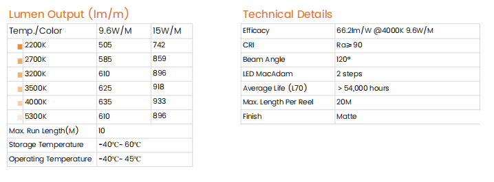 66.2lm/W @4000K 9.6W/M · Outdoor · White