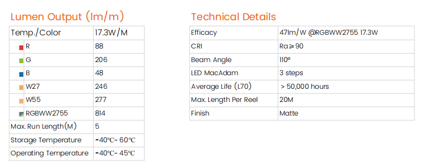 640 lm. @17.3W/m RGBWW(2700K+5500K) · Outdoor · Vertical bending